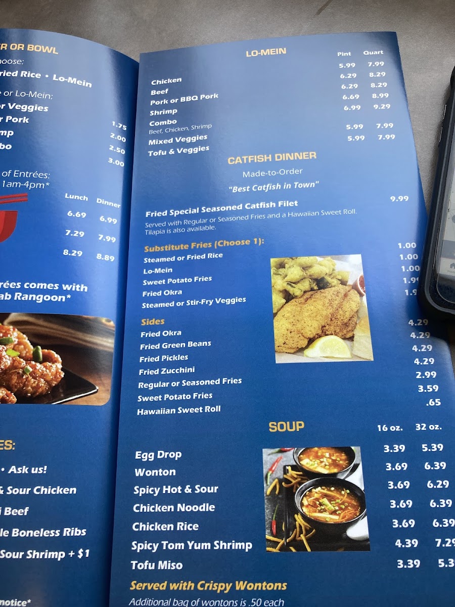 “ I ordered online before going and picking up. I got to the restaurant to pick it up and I could tell they'd been very busy. The guy working was very apologetic and said it would be a minute. It took a bit but he kept acknowledging me and apologizing. He was very kind and even gave me some free cookies and crab Rangoon for the wait. The food was amazing and staff was very kind. 100% recommend! ”